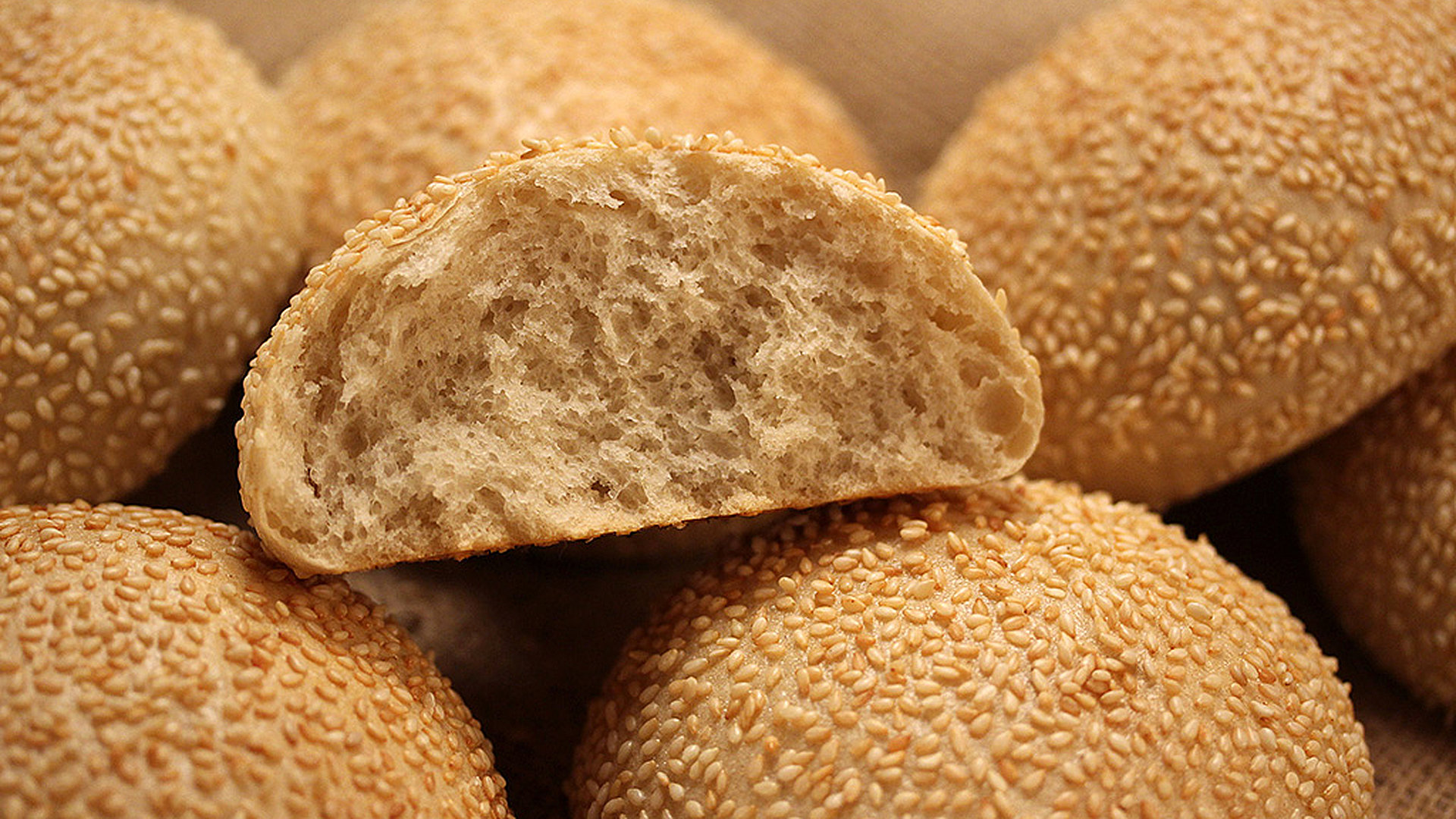 Um den Sesam schön gleichmäßig auf den Teigling zu bekommen, habe ich die geformten Teiglinge bei halber Gare mit Wasser bestrichen, und danach als ganzes in den Sesam gelegt. Zuvor kann man die Teiglinge noch einmal mit der Hand flach drücken, dadurch wird die Form des Weckerls schöner, und die Porung der Krume wird gleichmäßiger und feiner.